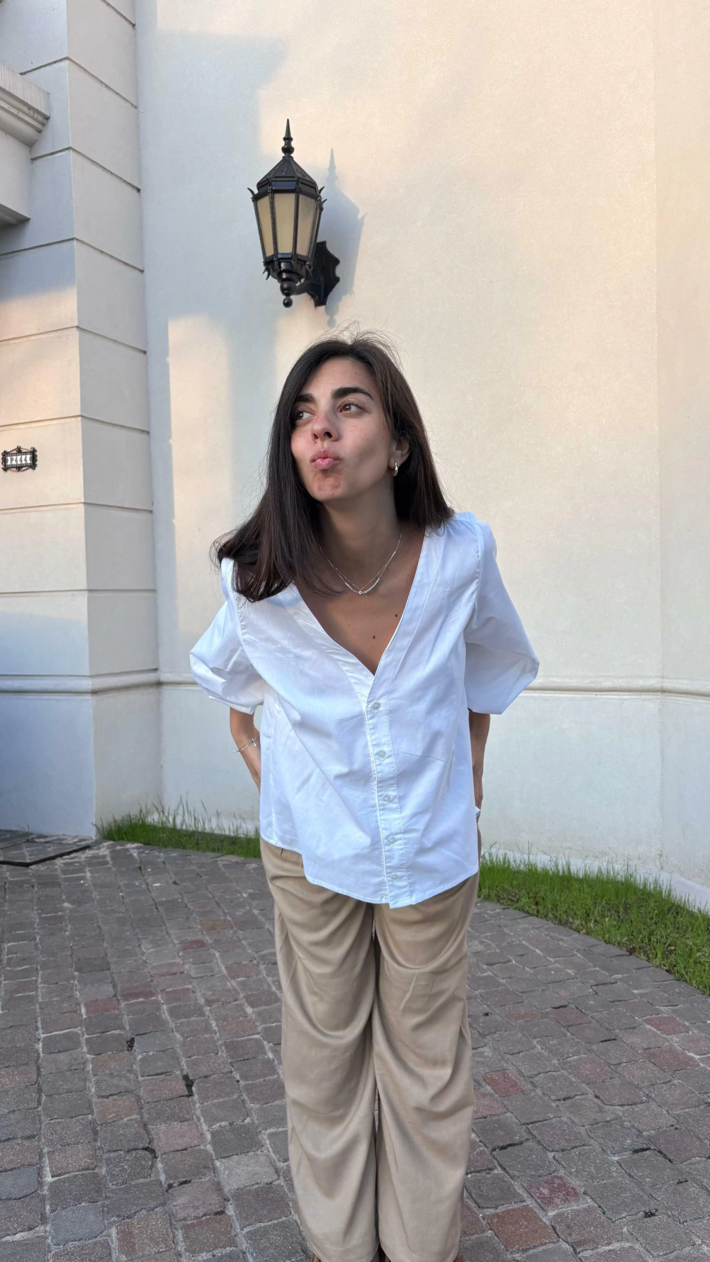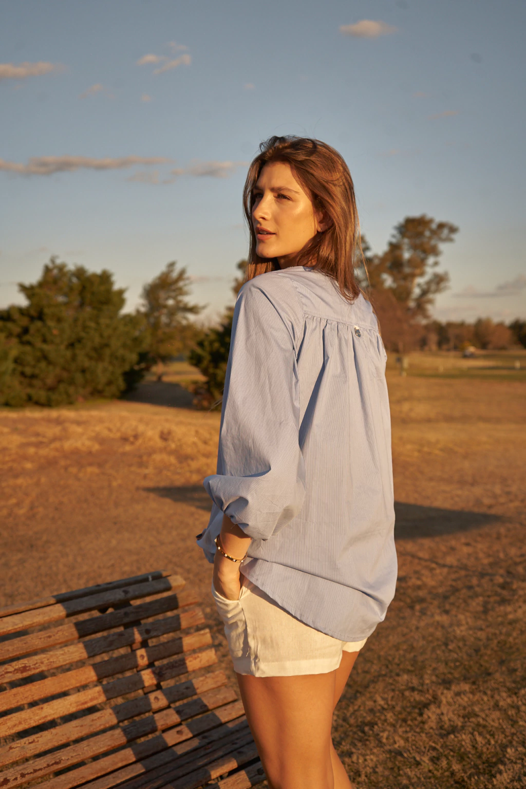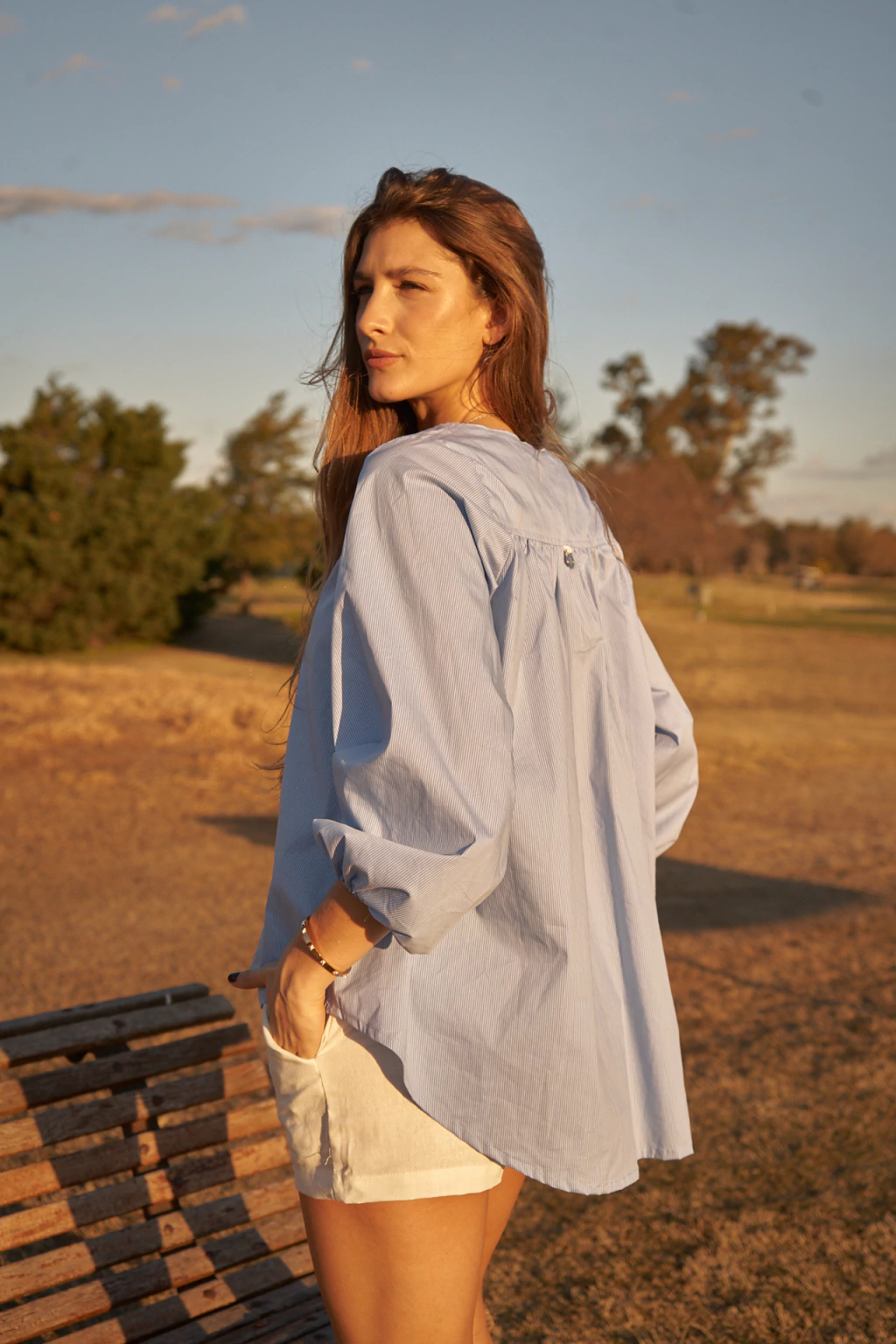 Descubrí la Camisa More en celeste y blanca, una prenda romántica confeccionada en poplin premium 100% algodón. Su diseño super amplio y la moldería especial realzan unas mangas increíbles, que aportan un toque sofisticado y único.