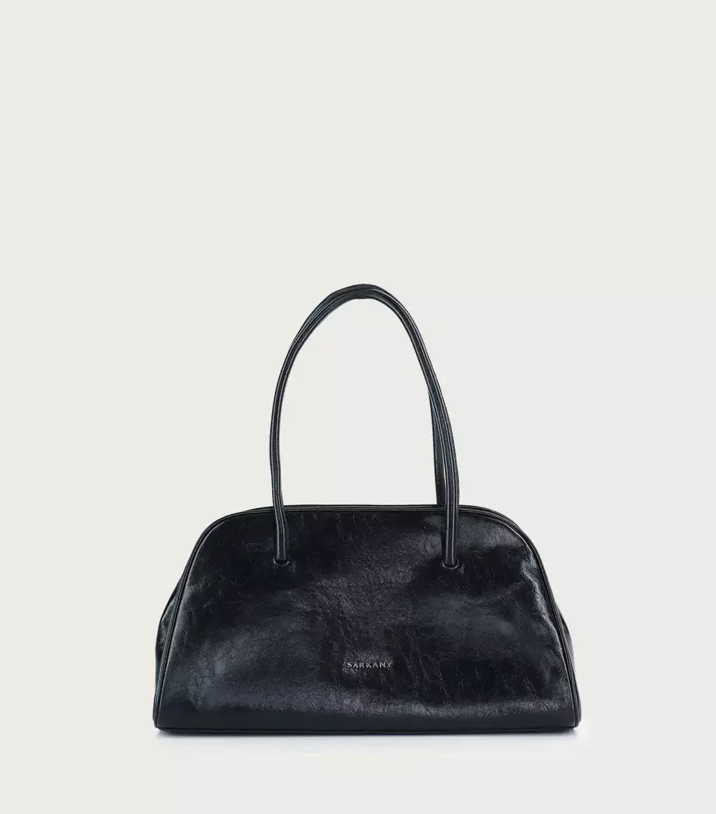 Cartera Linu Negro, tipo baul de fibras animal friendly con terminación charol.
