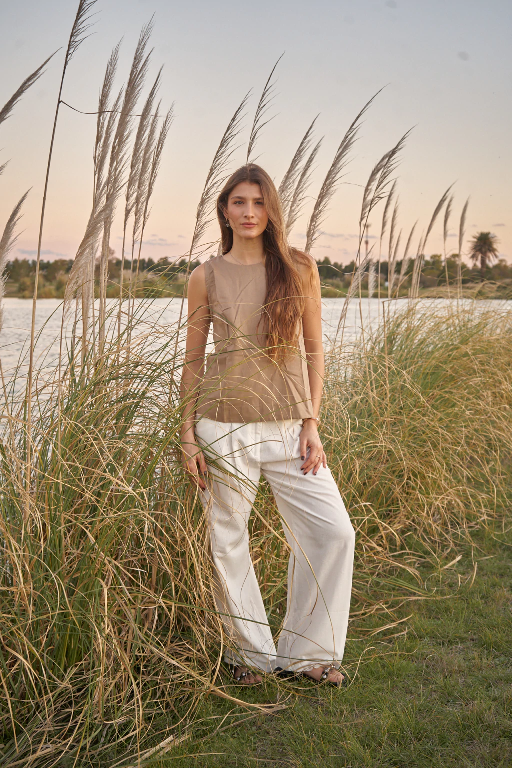 Pantalón sastrero tiro medio confeccionado en lino con gancho invisible y corte recto. Un estilo fresco y sofisticado. Esta disponible en blanco y en negro. Viene en combinacion con TOP IBIZA, TOP CHIA Y TOP PADUA
